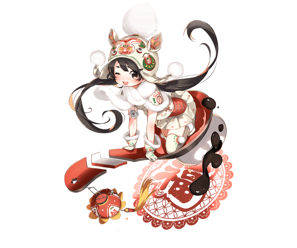 元气小妹妹。平日里经常练习写福字,到了每年特定的时候会骑着调羹去四处分发福字,并祈祷福字能带给人们一整年的幸福。所以人们每年都特别期盼着她的到来。